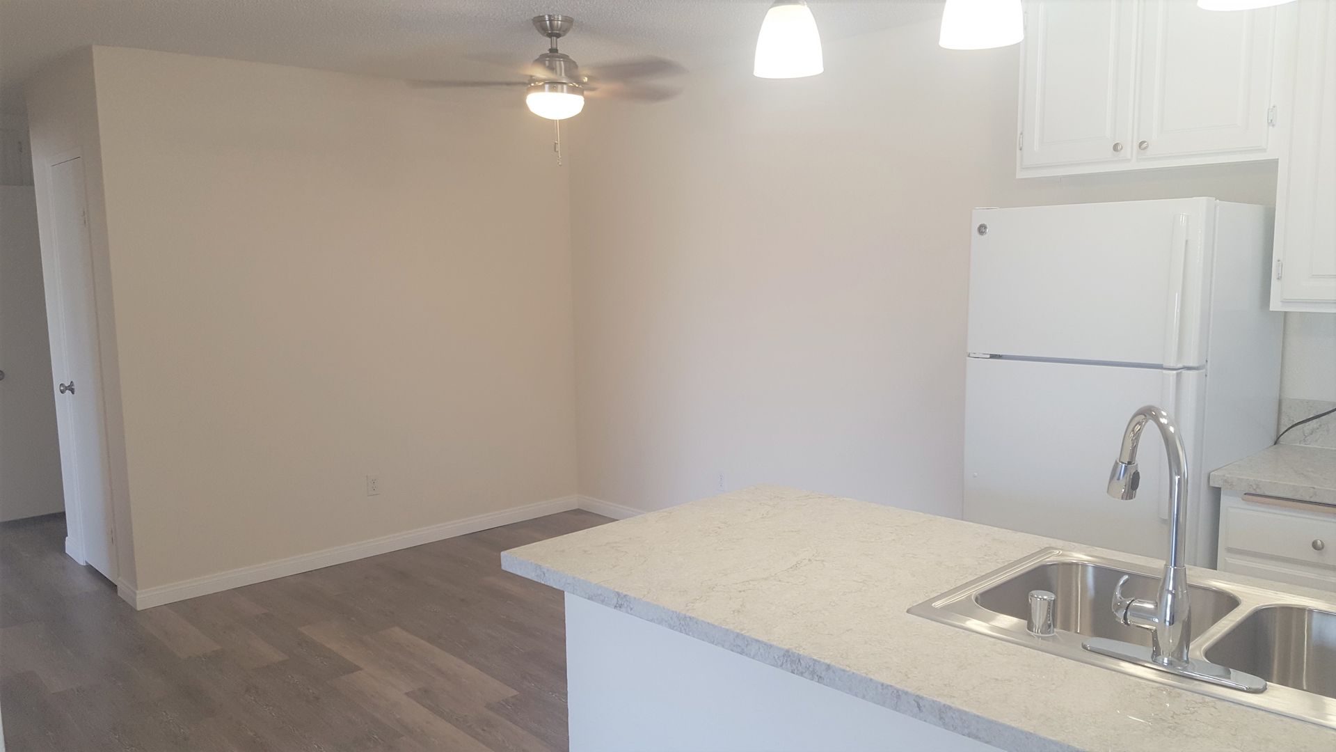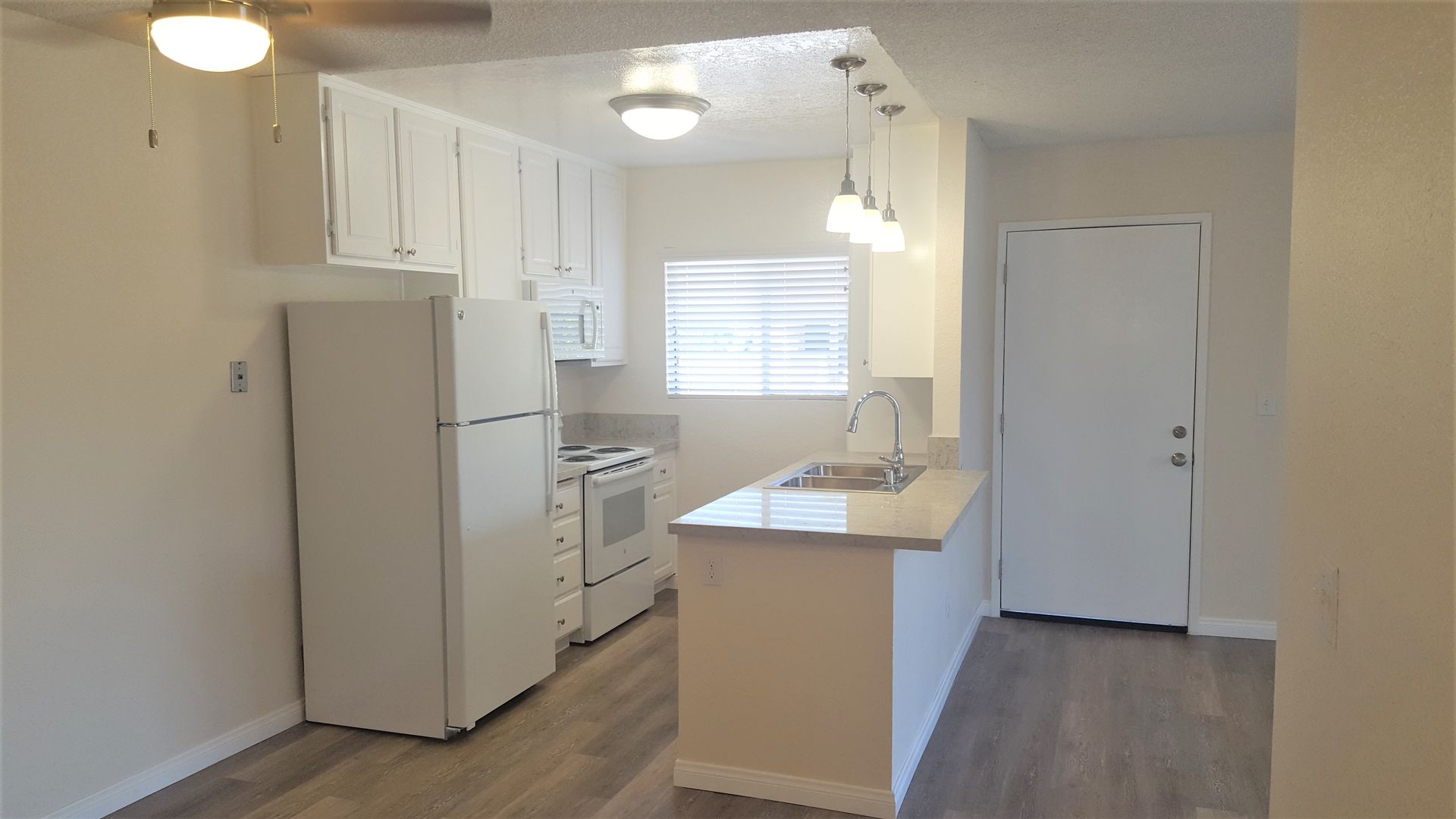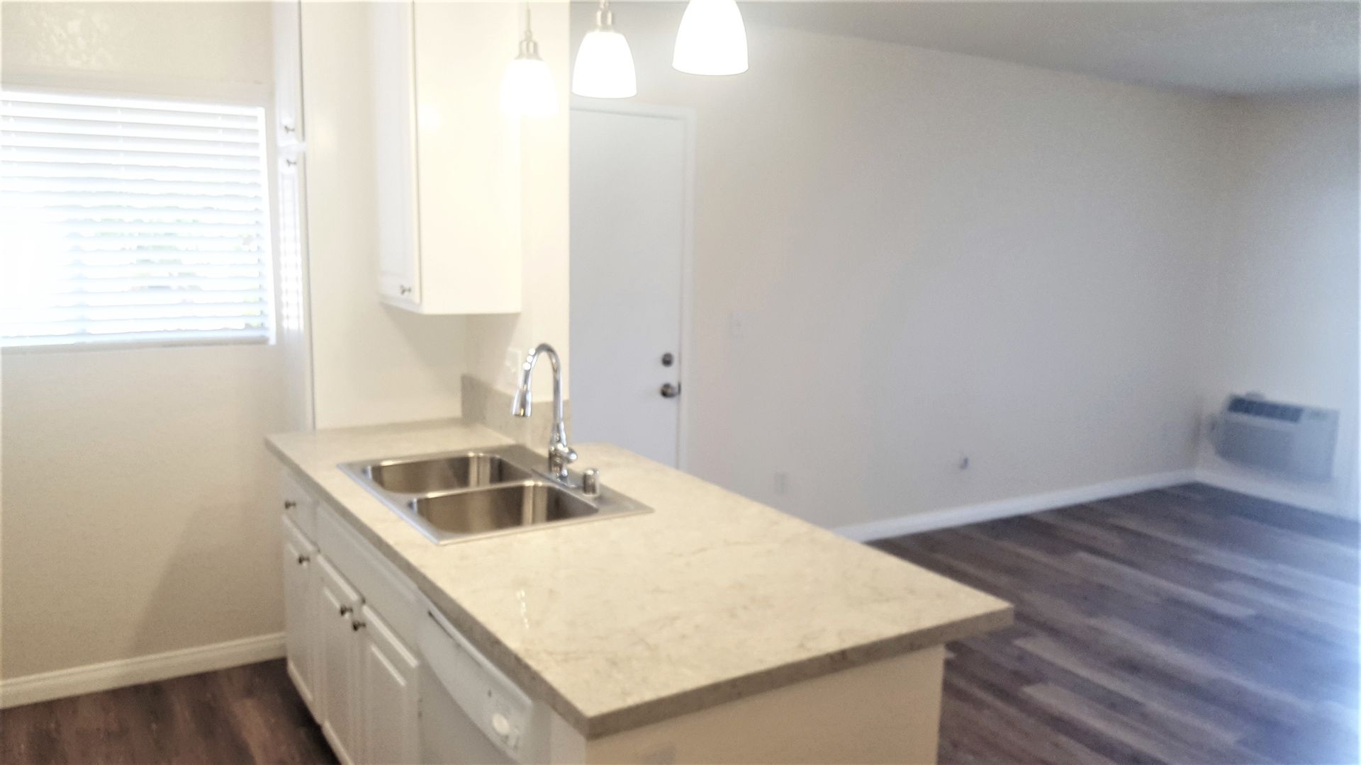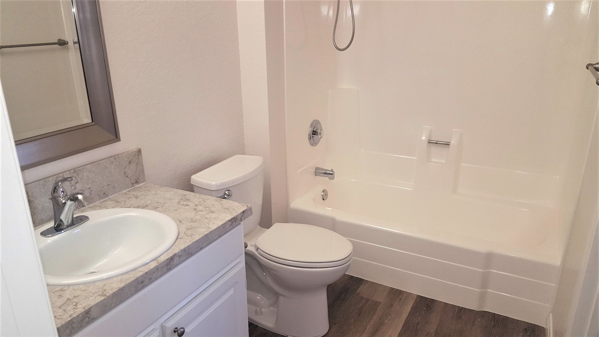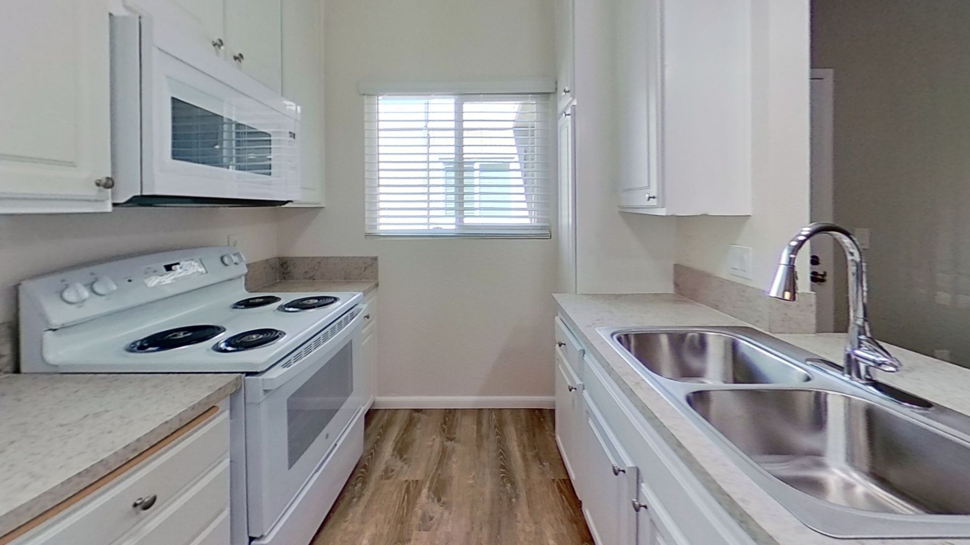 Plank flooring and Granite countertops.